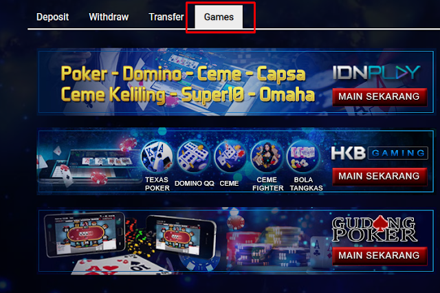 2. Transfer chips dari Dompet Utama ke salah satu server Poker yang ingin kamu mainkan, kemudian klik GAMES dan akan muncul pilihan server permainan Poker.
