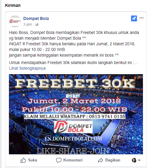 NB : Semua syarat yang ditentukan harus dilakukan terhitung mulai berlakunya promo Freebet 30k, jadi Share Fanpage Group dll harus dilakukan mulai tanggal 2 Maret jam 10.00 WIB.
