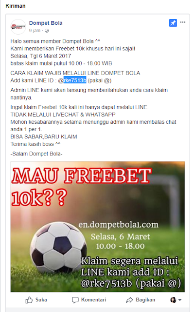 Like dan Share Postingan yang ada di Fanpage Dompetbola : https://www.facebook.com/dompetbolaofficial/
