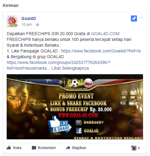 Like, Share dan Post ulang Postingan Freebet Goal4d dengan disertai status kata kata berikut ini: