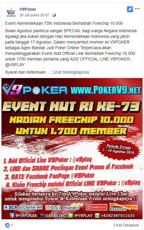2. Like dan Share postingan Event promo Kemerdekaan di Fanpage V9Poker
