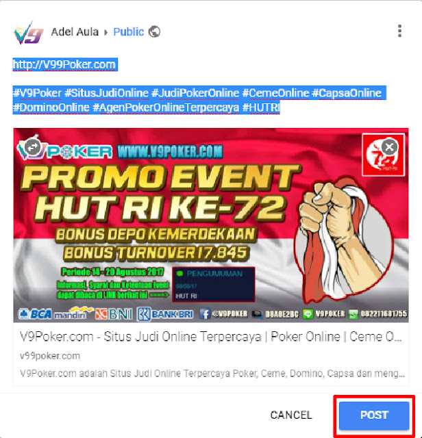 POSTING / PASANG Status semenarik mungkin di Social Media (Facebook / Twitter / Google Plus / Instagram) dengan menyertakan LINK V9Poker terbaru dan HASHTAG seperti pada contoh di bawah ini :