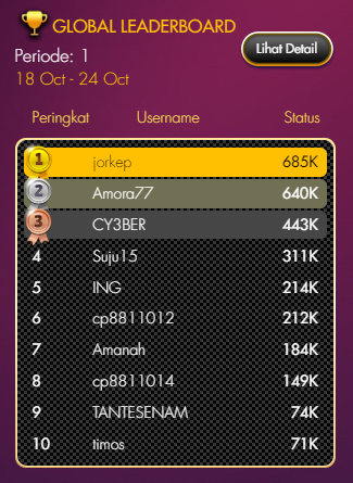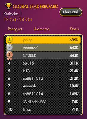 Sebagai contoh cara lihat Global Leaderboard pagi ini 18 Oktober, berikut Screenshotnya dimana peringkat 1 baru mengumpulkan Turnover sebesar 685.000 :
